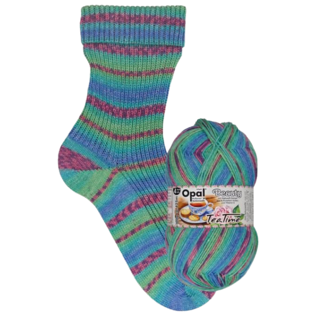Beauty by Opal creates a soft self striping pattern when knitted. With pops of contrasting colour in a semi-checkerboard pattern, you're sure to have your tea time guests begging you for the yarn!