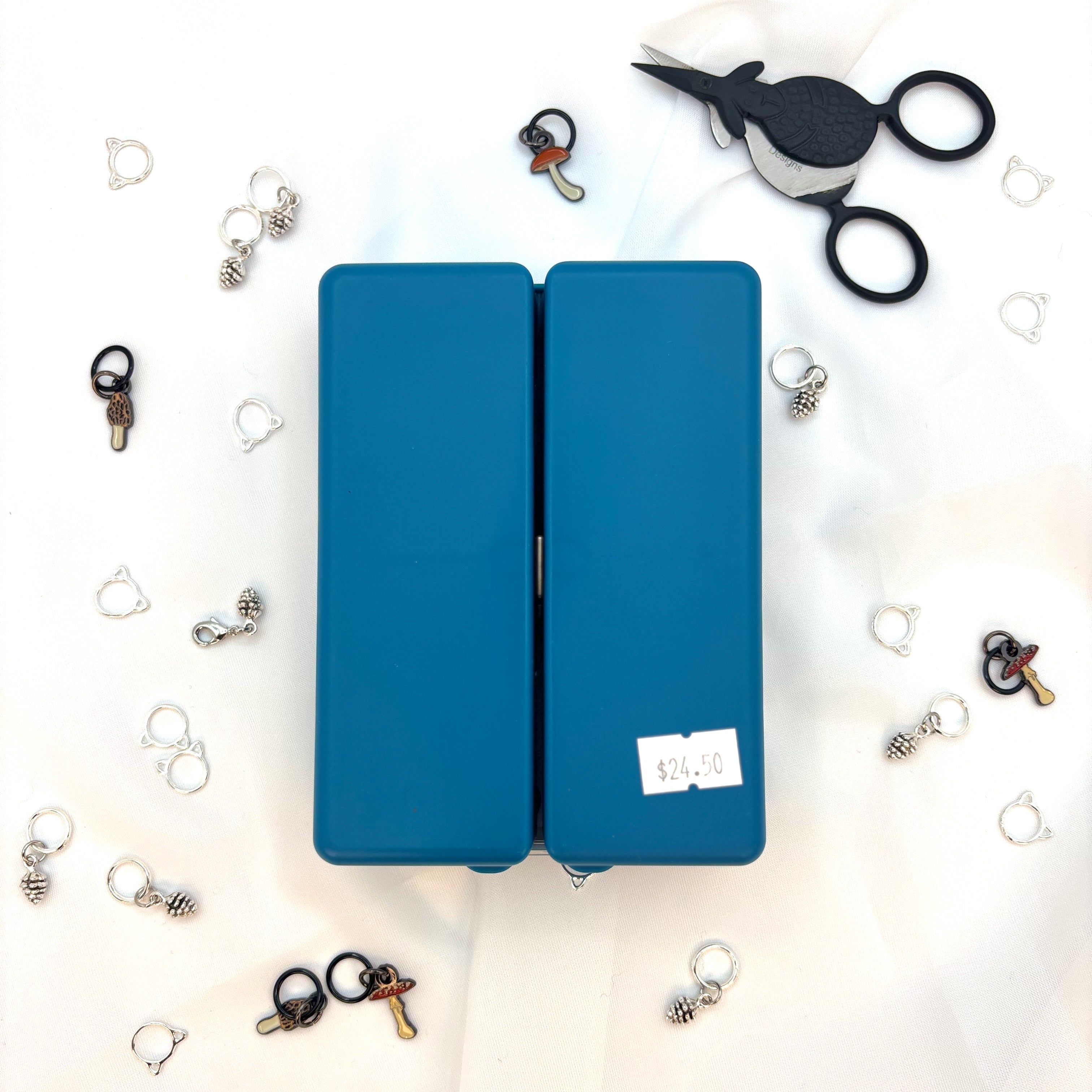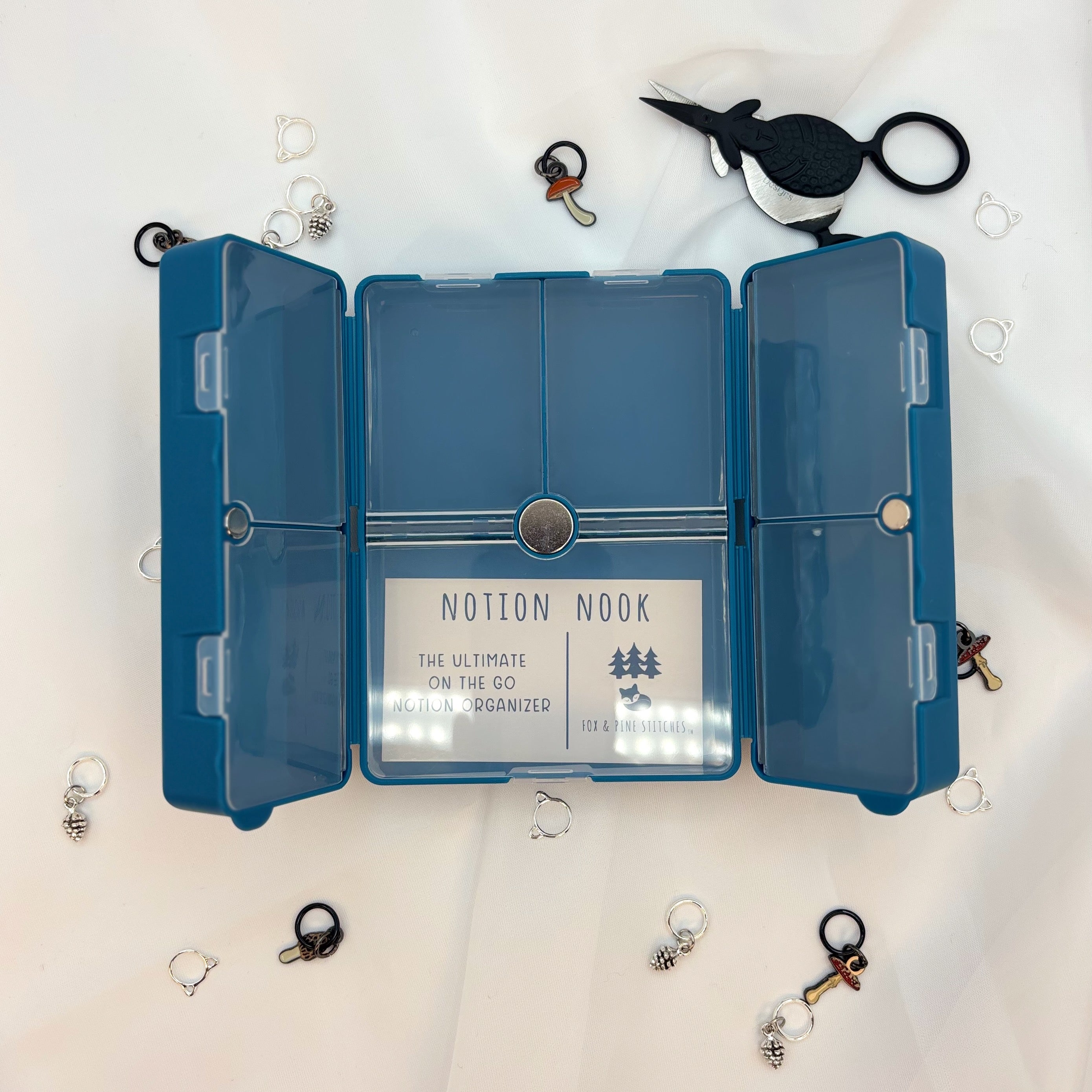 The ultimate on-the-go notion organizer. The high quality cases have transparent flaps for each compartment so you can see your collection of notions while keeping them organized in separate sections. The cases close securely with a strong magnet.